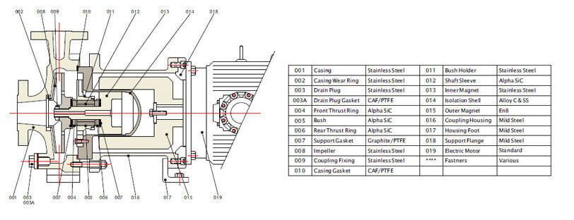 A group of drive magnets turns jointly with the electric motor shaft generating a magnetic torque that allows the second magnet group on which is moulded the impeller. These pumps do not have conventional mechanical shaft seals as pump chamber is shielded by casing and impeller is operated by magnets. This magnetic drive pump range due to absence of shaft seal can be installed in all plants and machines where leakage problems must be avoided..